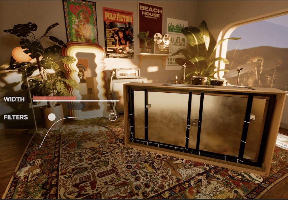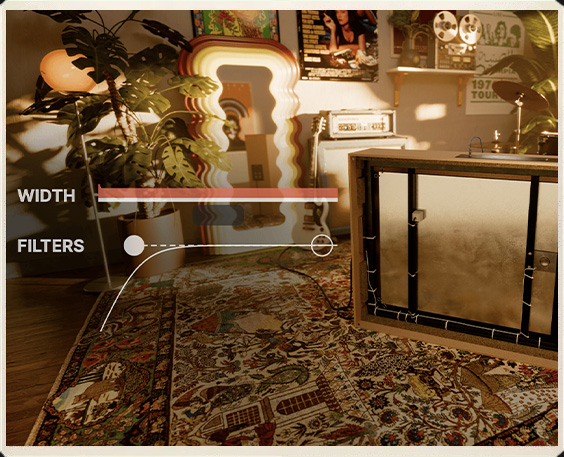 The plugin adds a continuous width control from true mono to a very wide stereo field, paired with gain compensated filters for precise tone shaping.